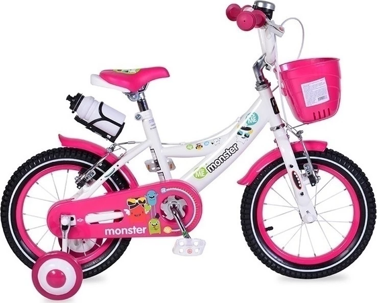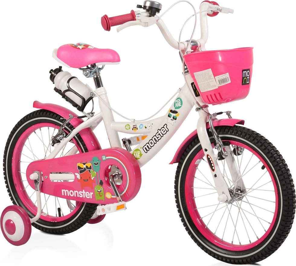 Ποδήλατο 16″ Monster 1681 Ροζ Κατάλληλο για παιδιά έως περίπου 4-8 ετών Προστατευτικό κάλυμμα αλυσίδας Γρήγορη ρύθμιση του ύψους της σέλας Αντιολισθητικά πετάλια για σταθερότητα και ασφάλεια V-Brake Φρένα Εμπρός-πίσω φτερά Περιλαμβάνονται οι 2 βοηθητικές ρόδες και κουδουνάκι, καλαθάκι, θήκη για μπουκαλάκι νερούΜεγεθολόγιο ποδηλάτων