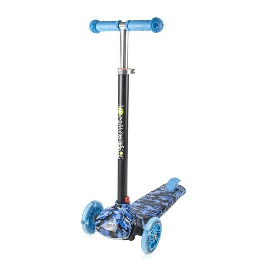 Lorelli Scooter Yuppee Blue Military Πατίνι με ρυθμιζόμενο ύψος 3 σημείων στο τιμόνι και αντιολισθητική βάση. Διαθέτει μαλακές λαβές TPR, φρένο στον πίσω τροχό με quick release σύστημα και φωτιζόμενους τροχούς. •μπροστινά ελαστικά πολυουρεθάνης με φως 120/24 mm •πίσω ελαστικά πολυουρεθάνης με φως 76/24 mm •Μέγεθος πλατφόρμας πολυπροπυλενίου: 280/120 mm…